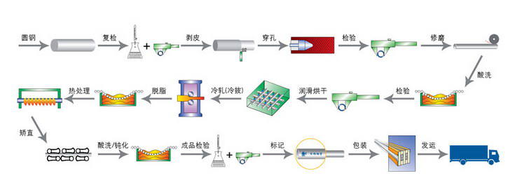 目前国内现有的无缝钢管生产装备水平参差不齐,既有落后的,也有最先进的。早期建设的热轧无缝毛、荒管生产设备较为简陋,技术落后,消耗高,污染严重,现已基本停产,但仍有部分处在半停半开状态。有的设备经过调整和改造,专门用于生产单一的品种,如一般用途的轴承管、低中压锅炉管、结构管、流体输送管等,其装备按照满足其定位品种和规格的质量和要求,进行调整和改造,达到降低投资、降低消耗和降低成本的先进工艺流程。