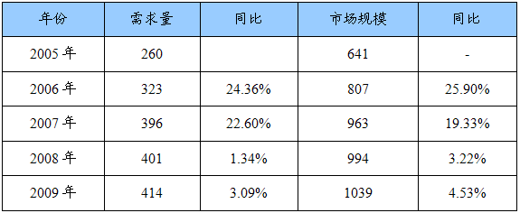 2005-2009年我国多层陶瓷集成电路封装外壳市场规模统计