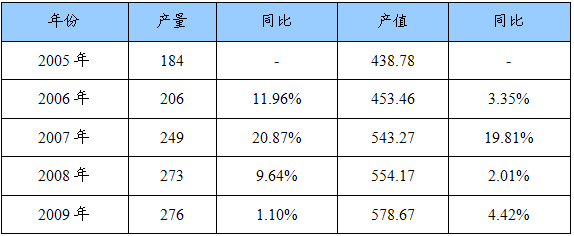 2005-2009年我国多层陶瓷集成电路封装外壳生产规模统计表