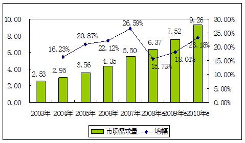2003—2010年金属碲产品市场需求及预测图