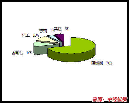 目前,世界锑品消费结构比例大致是:阻燃剂70%,蓄电池10%,化工10%,搪瓷和玻璃4%,其他6%。