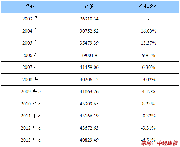 2003-2008年我国氧化铁脱硫剂产量及未来五年产量预测表