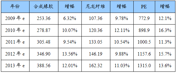2009-2013年我国墨水式笔头原材料产量及增幅预测表