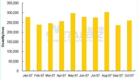 一、在出口价格上涨的刺激下,再次加征关税调控政策效果不明显。2007年以来,铁合金出口平均价格快速上扬,由年初1007美元/吨一路攀升5月份1209美元/吨,9月份达到1420美元/吨。在价格明显上涨的刺激下,第3季度出口量仍然高达81.4万吨,同比增长37.7%,其中8月份的出口量达30.3万吨,为年内月度出口量的最高点。