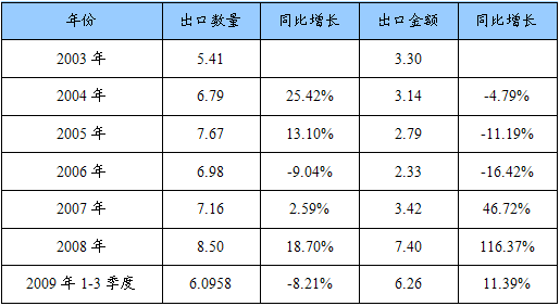 2003-2009年三季度维生素C及其衍生品出口数量及金额统计