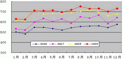 我国钢材产品自2003年以来产量保持快速增长趋势,2003年产量为2.2亿吨,至2009年产品产量已经接近7亿吨。