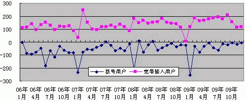 互联网用户:基础电信企业的互联网用户进一步趋向宽带化。2009年,基础电信企业净增互联网宽带接入用户2034.7万户,达到10322.6万户,而互联网拨号用户减少了357.1万户。