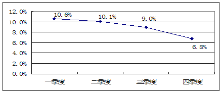 08半年中国经济增长开始放缓,GDP同比增长10.4%,比去年同期回落1.8个百分点;居民消费价格水平上涨7.9%。这表明“防过热”已见效,但物价涨幅较高仍未得到有效控制。
