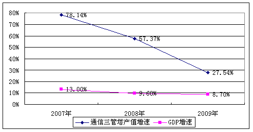 根据2007-2009年通信三管塔 行业 与宏观经济周期相关性的对比,可见我国通信三管塔与宏观经济周期正相关。宏观经济增长带动了国内电信投资业的增长,从而带动了通信三管塔产值的增长。