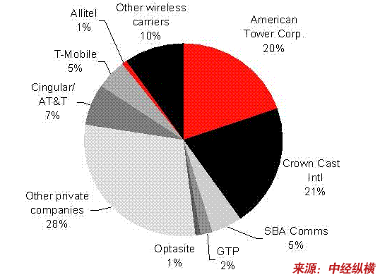 象AT&T这样的传统运营商只控制7%的铁塔配套设施,而且也是剥离相关资产后成立独立运营的铁塔租赁公司。其中排名在前的American tower目前每个铁塔上平均有约2.5个运营商在共享。北美移动通信基础设施共享率非常高。