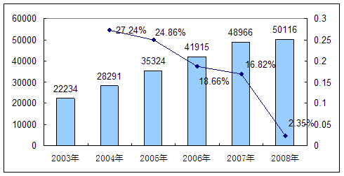 近年来,我国固定资产投资的高速增长推动钢材需求迅速增加,进而推动钢铁产能规模的快速扩张。从2001年开始,我国钢铁 行业 产能扩张开始加速,每年新增产能不断提高。2002~2006年是钢铁 行业 固定资产投资增长较快的时期。从 行业 的投资特点来看,产能释放主要集中在2004~2008年,其中2004年~2006年每年新增的粗钢产能均超过5000万吨。截止到2006年底,国内粗钢产能达到41914.9万吨,同比增长18.7%。2007年,国内粗钢产能达到48966万吨,同比16.8%。2008年粗钢产能为50116万吨。