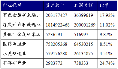 3、资产总额与利润总额比例高(24.74%),超过有色金属开采(17.92%),也就是说投资较少,利润相对投资来说很高。