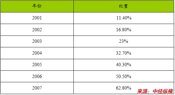 2001-2007年我国水泥产品新型干法产品占总数比例