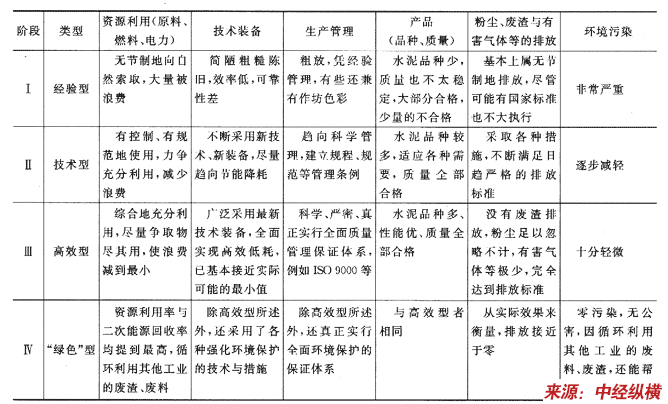 自从世界上第一台生产波特兰水泥熟料的立窑诞生以来,水泥工业已经走过了160多年的历程。虽然不同的国家和地区,其水泥工业的发展进程因国情的差异而各不相同,有先后之分,快缓之差。但是,回首过去,展望未来,从技术水平、生产管理和环保意识出发,世界各国水泥工业的发展是具有明显的共同性的,可以分为下述四个发展阶段,即从低级到高级,从必然到自由的阶段。处于不同的发展阶段,就会出现相应的不同面貌的水泥工厂,其所采用的技术装备、管理水平以至水泥品质都会有较大的差距,对自然资源(原料和能源)的有效利用,对生态环境的保护意识与措施则尤为悬殊,因而其结果也显然不同,似有天壤之别。
