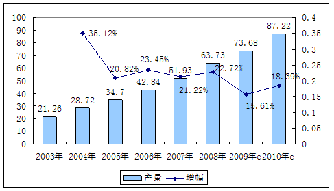 2003-2010年我国输电线路铁塔产品产量 分析 及预测图