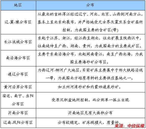 天然石英砂主要分布在内蒙古通辽,辽宁彰武,吉林双辽和东南沿海的山东荣成,福建东山,广东惠东、阳江、电白、湛江,广西北海,海南文昌、儋州等地,质量(品位)北低南高。石英砂岩主要分布在河北雷庄、赞皇,北京房山,山东沂南、苍山,河南泥地、密县,湖南石门、淑浦,云南昆明等地;石英岩主要分布在辽宁本溪、庄河,安徽凤阳,陕西汉中,甘肃永登,青海大通等地。脉石英主要分布在江苏东海,湖北蕲春,安徽贵池,陕西安康,新疆哈密等地。