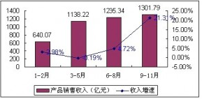 2009年,我国食用油加工 行业 销售收入逐季增加,自三季度起,收入增速也快速增加。2009年3-5月, 行业 累计销售收入1138.22亿元,比上一年同期下降了0.19%,进入三季度, 行业 快速复苏,销售收入不断增加,9-11月份, 行业 销售收入1301.79亿元,比上年同期增长21.31%。较高的增速一方面是由于 行业 复苏势头强劲,另一方面也有去年同期较低的基数有关。