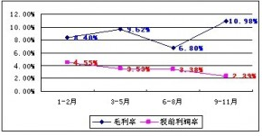 行业 盈利能力方面,2009年前三季度, 行业 盈利能力比上一年同期相比出现了下降,由于上一年第四季度 行业 整体亏损,因此2009年全年 行业 盈利能力优于上一年。分季度看, 行业 毛利率呈现增加的趋势,而由于期间费用的快速增加,税前利润率则呈现逐季下降的趋势。2009年1-11月,我国食用植物油加工 行业 规模以上企业毛利率为10.98%,净利率为2.39%。