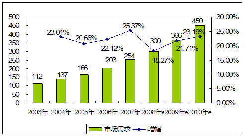 近几年我国石油钻机电气控制系统的市场需求量及增长率发展较快,2003年我国石油钻机电气控制系统的市场需求为112套,2004年市场需求量为137套,比上年增长了23.01%,2005年市场需求为166套,比上年增长了20.66%。2007年市场需求为254套。增幅为25.37%。石油勘探和开采 行业 的快速发展使得我国石油钻机电气控制系统的需求增长迅速。但受金融危机的影响,2008年下半年市场需求增速出现下滑,全年市场需求增速下降到18.27%,而预计2009年、2010年随着我国下游市场对石油钻机电气控制系统需求的增加,市场需求将逐渐恢复,并且仍将保持较快的增长速度,到2010年市场需求达到450套。