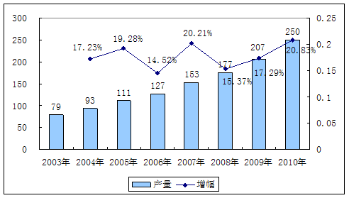 2003—2010年亚克力浴缸产品产量 分析 及预测图