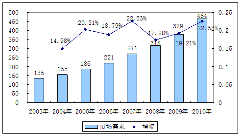 预计未来几年国内市场需求将以超过20%的速度增长。到2010年市场需求量将达到464万只。