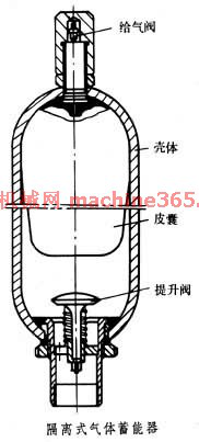气囊式蓄能器由耐压壳体、弹性气囊、充气阀、提升阀、油口等组成。可做成各种大小规格,适用于各种大小型液压系统;胶囊惯性小,反应灵敏,适合用作消除脉动;不易漏气,没有油气混杂的可能;维护容易、附属设备少、安装容易、充气方便,是目前使用和 研究 最多的。