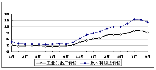 生产资料价格涨幅高位回落。9月份,流通环节生产资料价格比上月下降2.4%,已连续2个月环比下降;同比上涨17.5%,涨幅比上月回落5个百分点。工业品出厂价格同比上涨9.1%,比上月回落1个百分点;原材料、燃料、动力价格上涨14%。