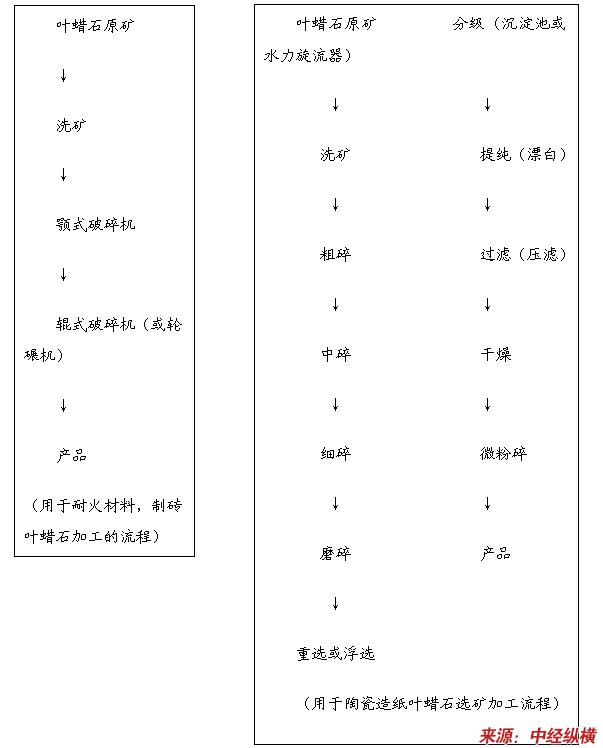 叶蜡石的选矿加工流程,就根据产品的要求而确定,如用于生产耐火材料、制耐火砖的叶蜡石,白度要求不高,产品粒度也不要求很细,制砖用叶蜡石粒度为3mm左右,通常为干法生产;用于陶瓷、造纸、农药载体等的叶蜡石,细度往往要求在200目以下,白度85%以上,这时流程中除粗、中、细碎外,还要用悬辊粉碎机进行粉碎,要选矿,甚至还要漂白才能达到要求,这时多用湿法作业。