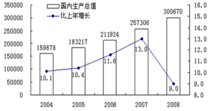 初步核算,2008全年国内生产总值300670亿元,比上年增长9.0%。分产业看,第一产业增加值34000亿元,增长5.5%;第二产业增加值146183亿元,增长9.3%;第三产业增加值120487亿元,增长9.5%。第一产业增加值占国内生产总值的比重为11.3%,比上年上升0.2个百分点;第二产业增加值比重为48.6%,上升0.1个百分点;第三产业增加值比重为40.1%,下降0.3个百分点。