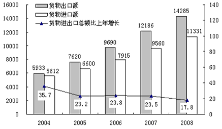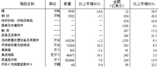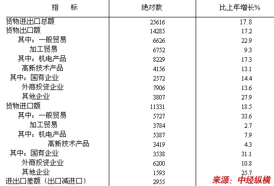 全年货物进出口总额25616亿美元,比上年增长17.8%。其中,货物出口14285亿美元,增长17.2%;货物进口11331亿美元,增长18.5%。进出口差额(出口减进口)2955亿美元,比上年增加328亿美元。