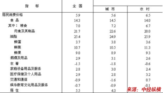 居民消费价格比上年上涨5.9%,其中食品价格上涨14.3%。固定资产投资价格上涨8.9%。工业品出厂价格上涨6.9%,其中生产资料价格上涨7.7%,生活资料价格上涨4.1%。原材料、燃料、动力购进价格上涨10.5%。农产品生产价格上涨14.1%。农业生产资料价格上涨20.3%。70个大中城市房屋销售价格上涨6.5%,其中新建住宅价格上涨7.1%,二手住宅价格上涨6.2%;房屋租赁价格上涨1.4%。