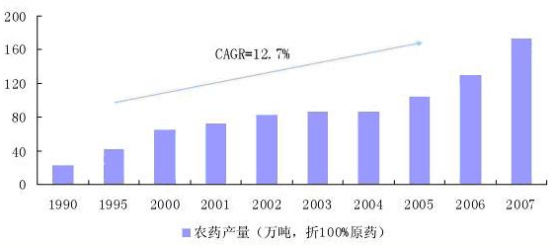 2007年国内共完成农药产量173.1万吨(按有效成分计),我国因此首次超过美国,成为世界第一大农药生产国。同时,我国农药的产量已远超过国内需求量,市场竞争将会加剧。