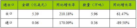 其中农药原药出口数量为5.96万吨,同比增长61.47%;出口金额为5.39亿美元,同比增长210.18%。