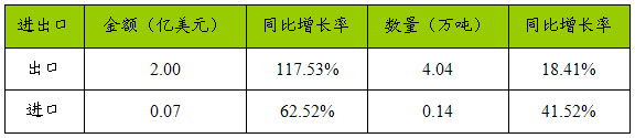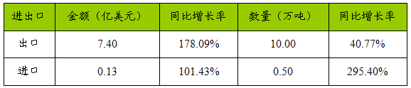 根据 海关数据 统计,2008年7月份,我国农药出口数量为10.00万吨,比2007年同比增长40.77%,出口金额为7.40亿美金,同比增长178.09%。进口数量为0.50万吨,同比增长295.40%;进口金额为0.13亿美元,同比增长101.43%。