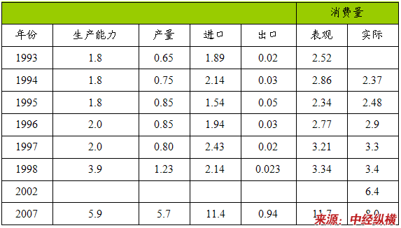 从1993年到2007年我国乙醇胺供需状况如下表所示: