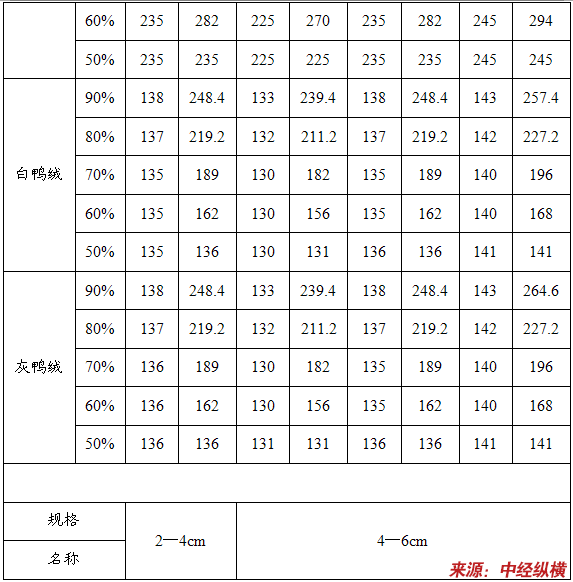 中国鸭绒产量占羽绒总产量的90%,鹅绒产量只占10%。