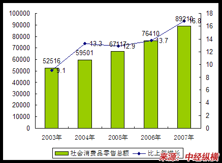 2003-2007年社会消费品零售总额及其增长速度