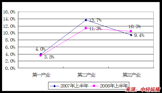 2008年上半年我国国内生产总值130619亿元,同比增长10.4%,比上年同期回落1.8个百分点。其中第一产业增加值11800亿元,同比增长3.5%,比上年同期回落0.5个百分点;第二产业增加值67419亿元,同比增长11.3%,比上年同期回落2.4个百分点;第三产业增加值51400亿元,同比增长10.5%,比上年同期回落1.6个百分点。