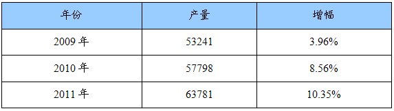 2009年——2011年钢材产量及增幅预测表