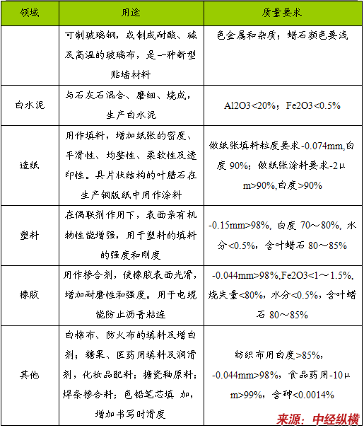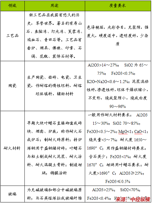 叶腊石是具有多种用途的非金属矿物原料,主要用途有:(1)耐火材料—生产各种叶腊石质耐火砖、耐火泥和坩埚等;(2)陶瓷—生产建筑陶瓷、卫生陶瓷和特种陶瓷等;(3)药剂—用作各种农药和杀虫剂载体等;(4)填料—用作造纸、橡胶、塑料、油漆、化妆品和路面填料;(5)玻璃纤维—生产玻璃纤维的无碱玻璃球和中碱玻璃球等;(6)涂料—生产各种耐高温耐腐蚀涂料和冶金铸造特种涂料等;(7)固体密封和传压材料—用作人造金钢石合成的固体密封材料等;(8)建筑材料—生产白水泥和屋面防水材料等;(9)雕刻—雕刻各种人物、山水、花果、动物和印章石等美术工艺品;(10)其他—生产洗涤剂和分子筛等原料。
