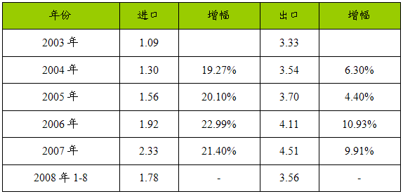 2003-2008年1-8月我国优氯净进出口量值 分析