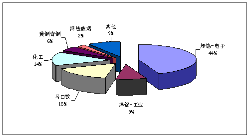 中国轴承合金目前仍使用含锡80%以上的巴氏合金,而工业化国家逐步改用铝基合金钢(含锡6%-22%)和铜、铅、锡合金钢(含锡3.3%-8%)。焊锡应用广泛,主要是金属钎焊用的普通焊锡、电子和仪表 行业 用的软焊料两大类。目前中国机械、电子 行业 用锡量约占全国锡消费量的40%,是第一用锡大户。