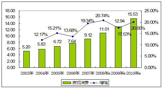 从我国羽毛球的表观消费来看,近几年来一直以10%以上的速率增长。2003年我国羽毛球的表观消费为5.20亿元,2004年增加到5.83亿元,比上年增长了12.17%,2005年表观消费为16.72亿元,2006、2007年分别为7.64、9.12亿元。预计2008年表观消费为11.01亿元,到2010年我国羽毛球的表观消费为15.53亿元。