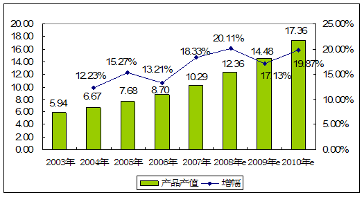 2003年我国羽毛球的产值为5.94亿元,2004年产值增加到6.67亿元,比上年增长了12.23%,2005年产值为7.68亿元,比上年增长了15.27%,2006年、2007年的产值分别为8.70、10.29亿元。其中2007年的产值增幅达到18.33%,为近年来的最快增幅。预计2008年由于北京奥运会的影响,我国羽毛球的产值将达到12.36亿元,全年产值增幅为20.11%,2009年在全球经济萎缩的情况下产值增幅有所下降,2010年产值增速逐渐加快,到2010年我国羽毛球的产值达到17.36亿元。
