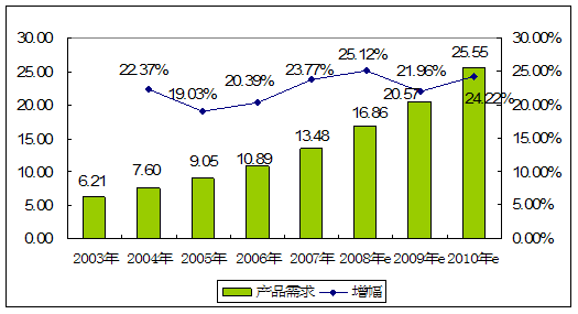 随着体育运动概念的兴起,不受场地限制的羽毛球市场需求发展较快,另外羽毛球属于易消耗商品,因此市场上对羽毛球的需求量较大。2003年我国羽毛球的需求为6.21亿元,2004年市场需求为7.60亿元,比上年增长了22.37%,从2006年开始,我国羽毛球的市场需求增长速度超过了20%,2007年市场需求增加到13.48亿元。奥运会的举办使羽毛球的需求迅速增长,2008年全年预计需求为16.86亿元,增幅达到25.12%,预计2010年市场需求达到25.55亿元。
