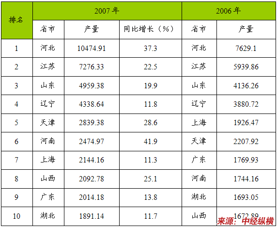 生产省份来看,2007年,钢材产量居全国前十位的省市共生产钢材40505.87万吨,占全国总产量的71.74%,同比新增钢材产量7905.4万吨,增长24.25%,比全国平均增速高1.55个百分点。