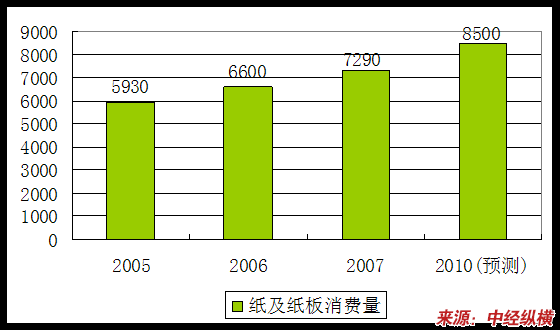 我国是世界造纸工业生产、消费和贸易大国,纸类生产量和消费量均居世界第二位,根据纸及纸板消费量指数与GDP指数的相关性 分析 ,并综合考虑影响国民经济发展的有关不确定因素和相关产业的发展前景,“十一五”期间,我国造纸工业仍将处于发展增长期。预计2006年至2010年纸及纸板消费量的年均增长速度为7.5%,2010年纸及纸板的消费量将从2006年的6600万吨增长到8500万吨左右。