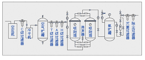 医用制氧机以变压吸附(PSA)技术为基础,从空气中提取氧气的新型设备,其利用分子筛物理吸附和解吸技术在制氧机内装填分子筛,在加压时可将空气中氮气吸附,剩余的未被吸收的氧气被收集起来,经过净化处理后即成为高纯度的氧气。分子筛在减压时将所吸附的氮气排放回环境空气中,在下一次加压时又可以吸附氮气并制取氧气,整个过程为周期性地动态循环过程。具体工作过程为压缩空气经空气纯化干燥机净化后,通过切换阀进入吸附塔。在吸附塔内,氮气被分子筛吸附,氧气在吸附塔顶部被聚积后进入氧气储罐,再经除异味、除尘过滤器和除菌过滤器过滤即获得合格的医用氧气。整个制氧过程为物理吸附过程,无化学反应。原料为空气,对环境无污染。