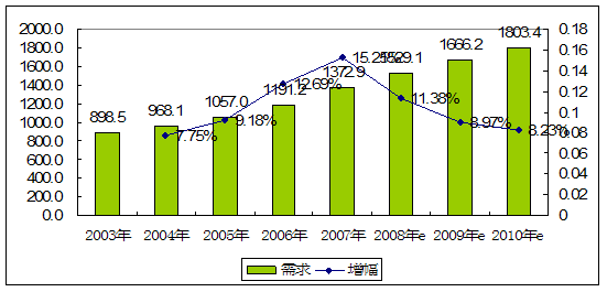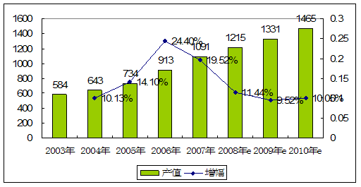 从图中可以看出,2003-2007年我国电动移液器产品产值不断增加,这一方面主要是受下游 行业 需求的不断推动作用,另一方面我国在电动移液器产品生产规模方面也有很大的提高,产量不断增加。