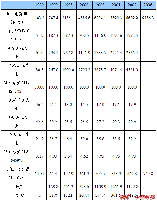2006年,全国卫生总费用达9856.3亿元,政府、社会和个人卫生支出分别占18.0%、32.6%和49.4%;人均卫生费用749.8元,卫生总费用占GDP4.67%。 2003年以来,卫生总费用和人均卫生费用递增,卫生总费用占GDP比重有所下降。四年间政府卫生支出比重增加1.0个百分点,社会卫生支出比重增加5.5个百分点,个人卫生支出比重减少6.5个百分点。统计数据显示,城市、农村居民人均卫生费用均在增长,城市居民人均卫生费用高于农村居民2倍多。预计2007年卫生总费用达到10488亿元,占GDP4.82%,人均卫生费用781元。